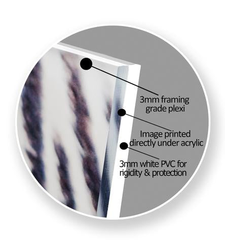 The Direct Print on Acrylic Decorative Plexi is achieved by laying down a sheet of framing grade plexiglass (acrylic) onto our Fuji Acuity UV flatbed printer and ink is sprayed directly onto the substrate and then cured by trailing UV lights. Thus the image is printed directly onto the rigid substrate (the acrylic). While a Direct Print on Acrylic Decorative Plexi looks equally stunning, the archivability, resolution and color gamut are slightly less refined than the Fine Art PlexiFoto combination.